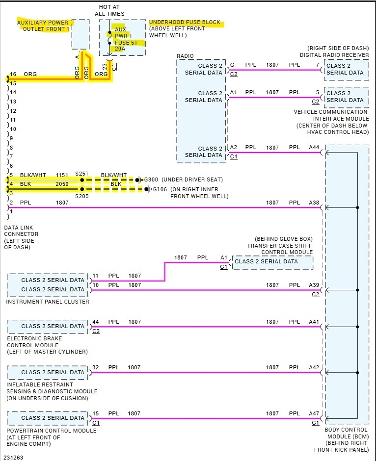 Here is the data bus wiring diagram, there doesn't seem to be a pinout diagram of the data link connector for this vehicle, but there is only 4 wires to this DLC, pins 4 and 5 are both grounds, pin 16 which is an Orange wire is the power feed, and pin 2 which is a Purple wire is the Class 2 GM LAN network wire, so identifying pin 16 should be pretty easy. Notice the fuse location and label, also the Front power outlet, if that shorted out it will pop the fuse that feeds pin 16 of the DLC.