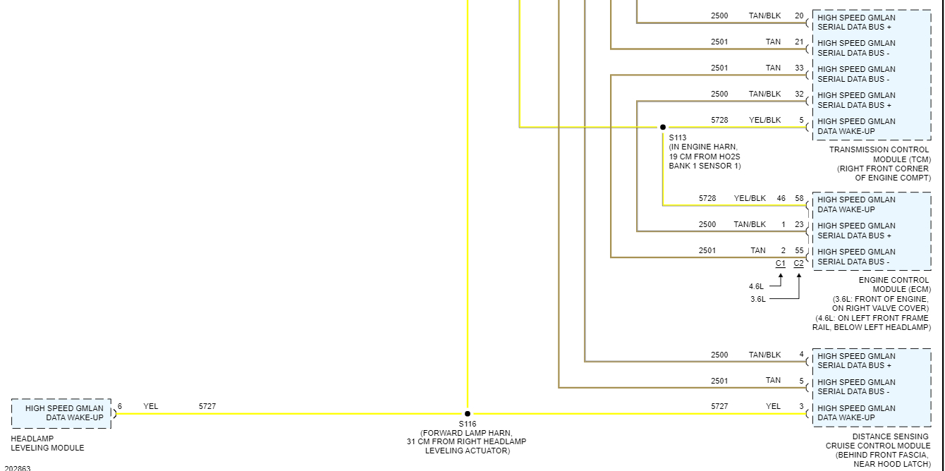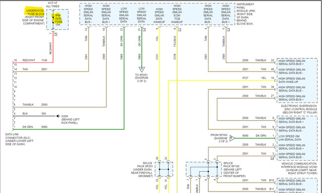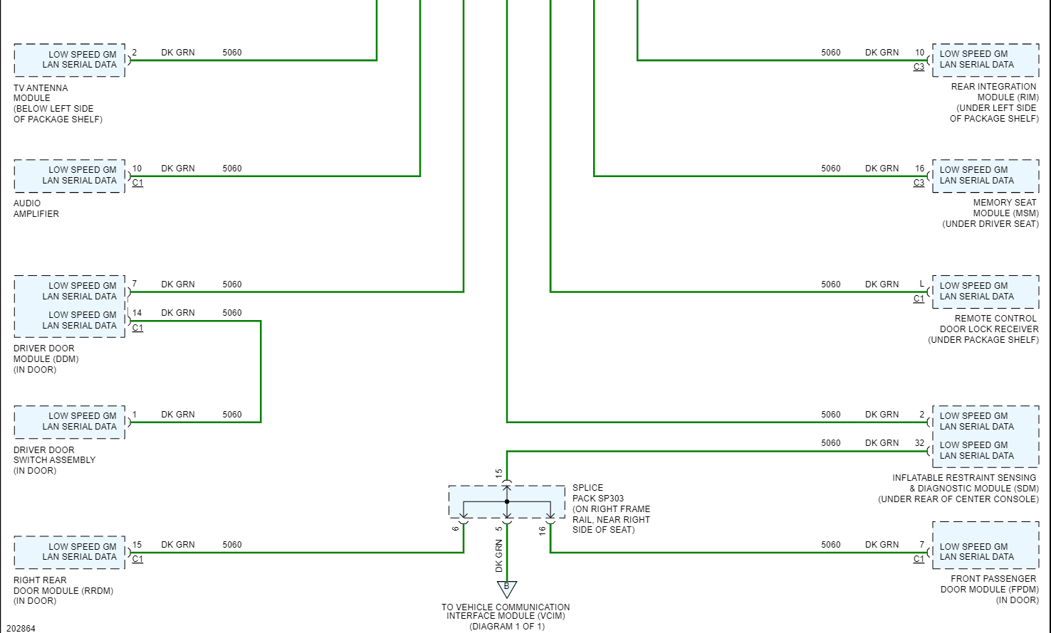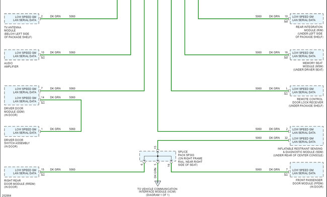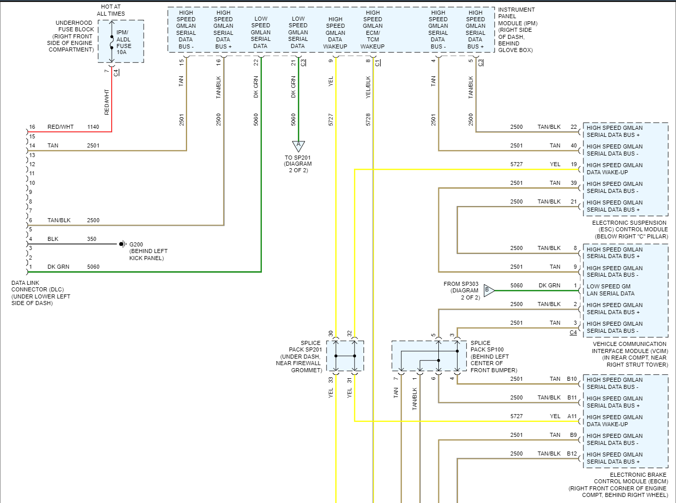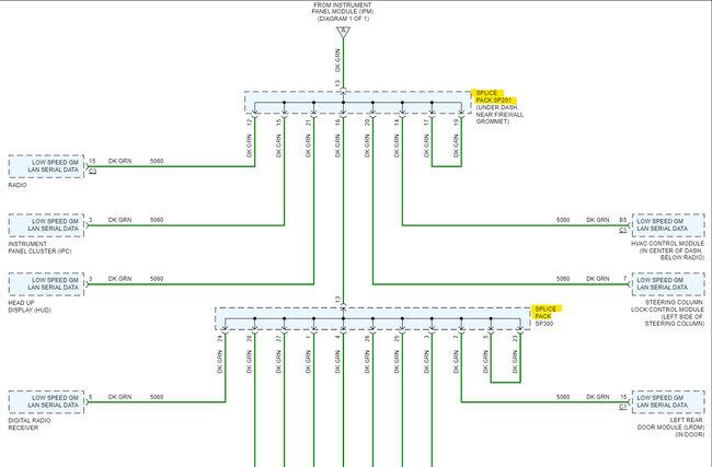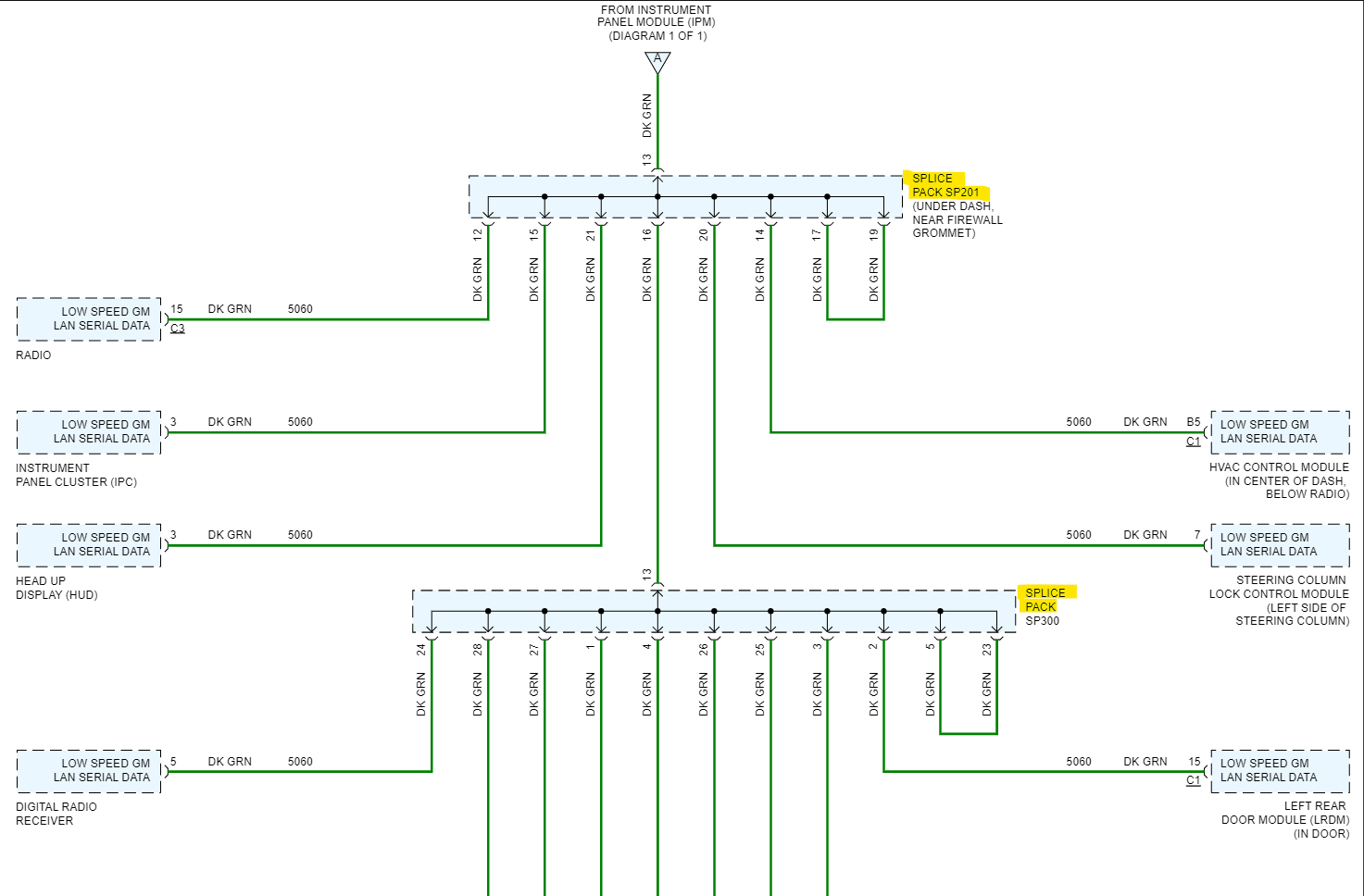 What can be happening here since GM uses a splice pack for most of the low-speed network, there can be another module that has failed or is shorted out and is pulling the entire network down. With these if the fuses are good, we will usually go to the splice packs and unplug each module one by one until the network returns to normal. If it is a wiring problem where the network wire has shorted to ground or shorted to power, the wire can be isolated in the same manner. This vehicle has a lot of modules though, and 2 main splice packs.