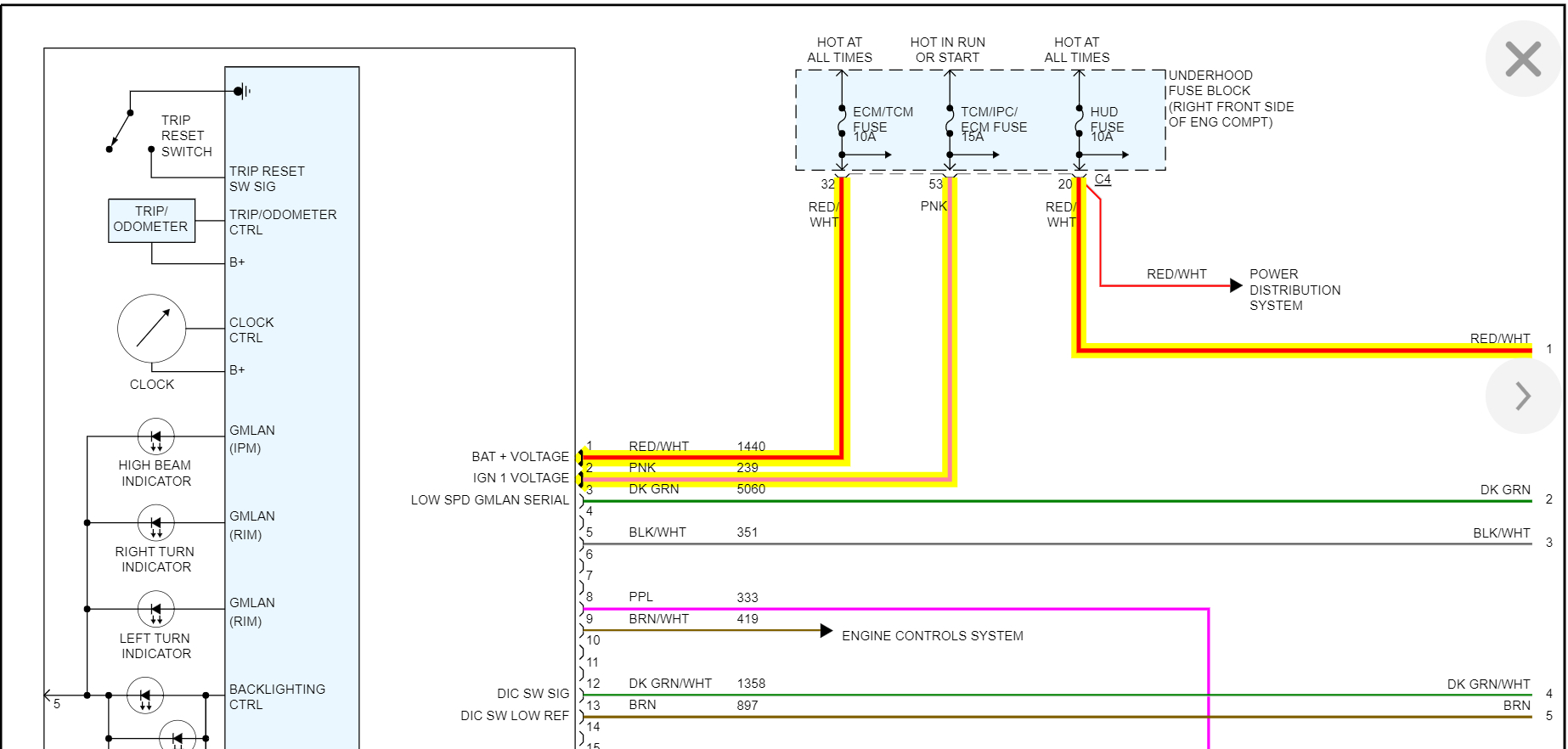 The 2nd diagram has the fuses for the Cluster. Check these first to see if any have burned out. This Instrument Panel module is not the dashboard gauges, it controls those gauges, but the Instrument Panel Module is actually behind the glove box. It controls the Heads up display as well as the Instrument Cluster (with the gauges) through the gm Lan data network.