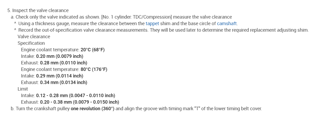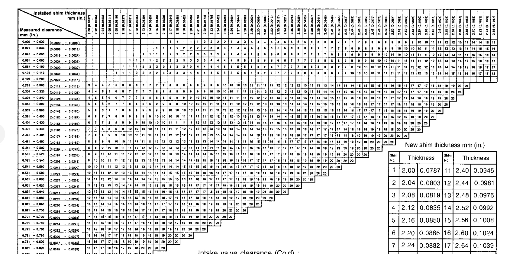 Exhaust: 0.25 - 0.31 mm (0.0098 - 0.0122 inch)