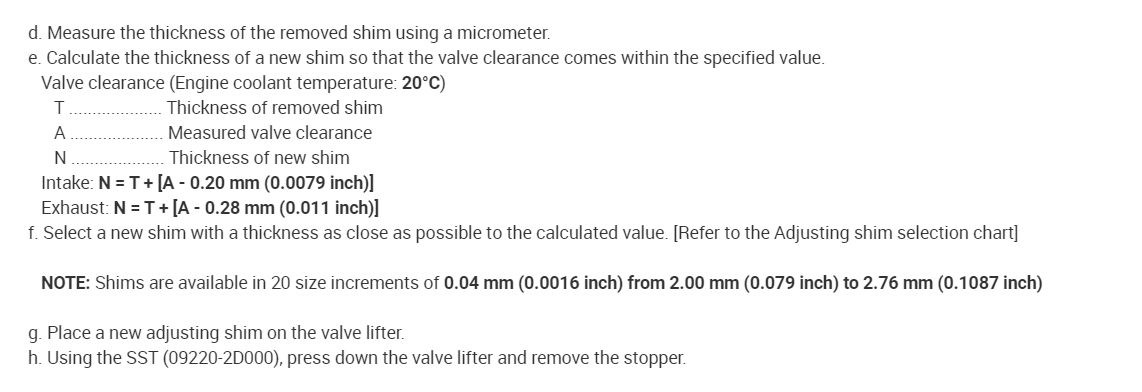 Exhaust: 0.20 - 0.38 mm (0.0079 - 0.0150 inch)