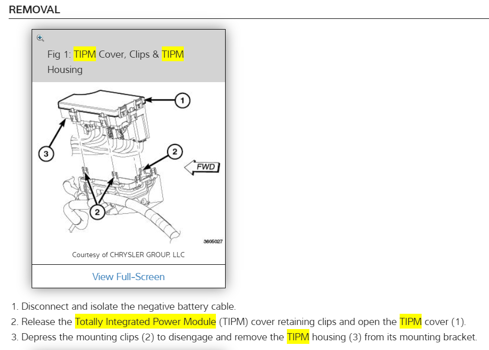 CAUTION: The original Cabin Compartment Node (CCN) and Powertrain Control Module (PCM) must be installed and functioning properly prior to powering up the new Totally Integrated Power Module (TIPM). The TIPM receives vehicle configuration data from the CCN and Vehicle Identification Number (VIN) information from the PCM. If configuration information becomes lost or corrupted, the data can be obtained from DealerCONNECT