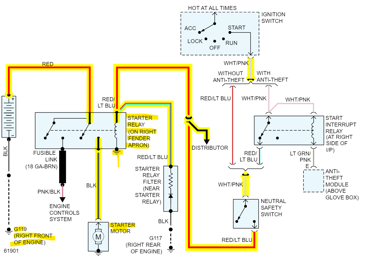 The diagram below is the Starter Motor circuit, there is a Starter relay on the right side (passenger side) of the engine compartment, just above the fender, most likely bolted to the body of the vehicle.