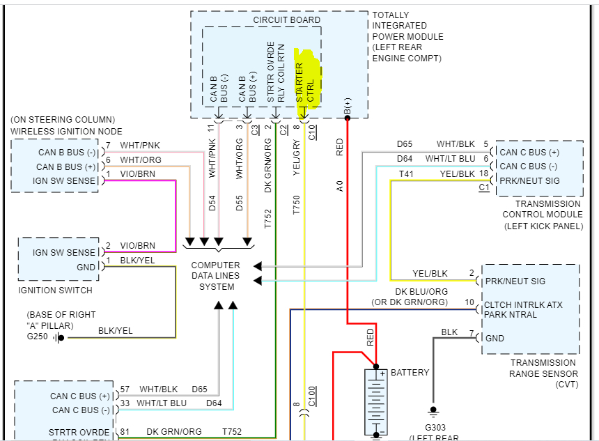 This vehicle doesn't have a traditional starter relay. In its place is a circuit board that is integral to the totally integrated power module (TIPM).