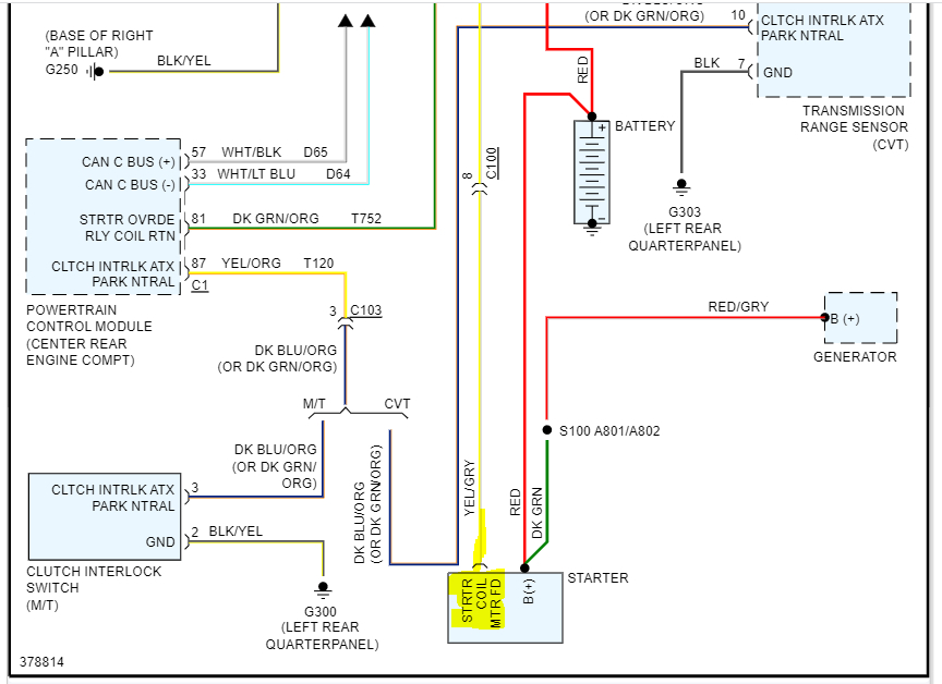 Anyway, I attached the wiring schematic for the starting circuit. I highlighted what has taken the place of the relay. What I need you to do is have a helper turn the key to the start position while you check for power at the yellow wire with a white tracer on the starter.