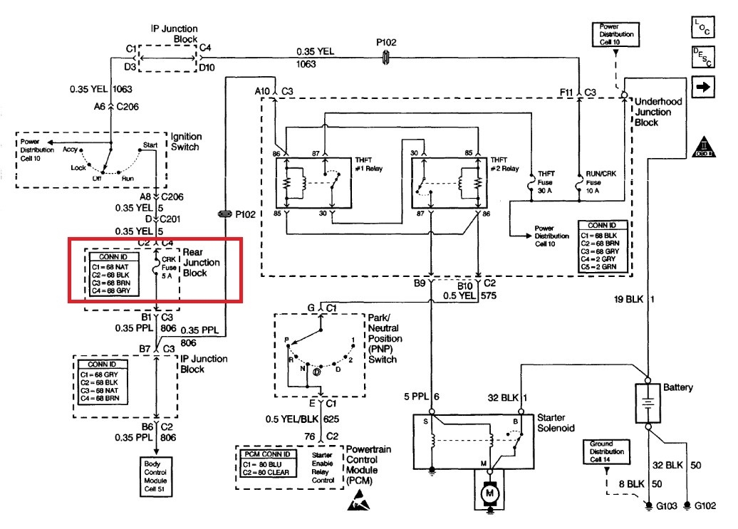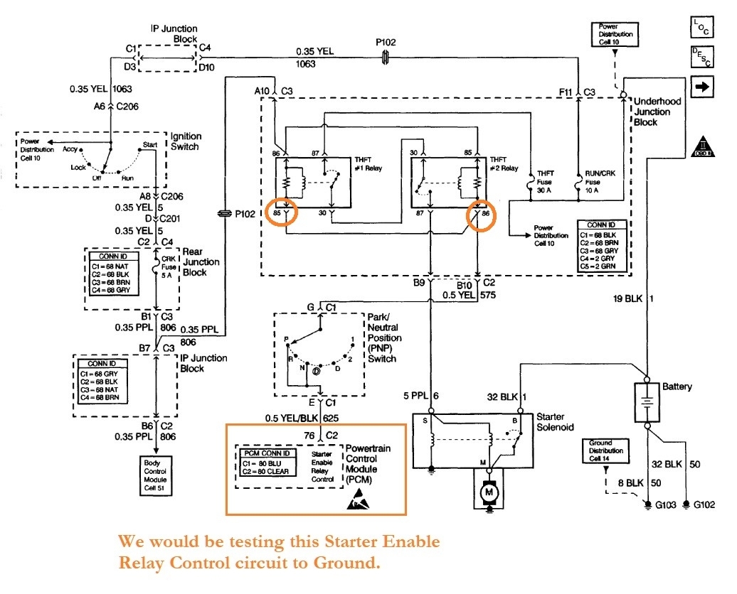 This test is checking there is a good circuit threw the PNP switch, threw the PCM to Ground. Thats how the PCM controls these relays, it grounds both THFT 1 and 2 relays during crank.
