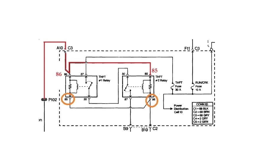 Sorry we must be in different time zones, I would use a multimeter, take out the THFT 1 Relay and first make sure there is power on pin 86 during Crank, which is just above pin 85 on the diagram below, if power is good, then leave your meter on battery Neg, and check pin 85 during Crank, you will be measuring voltage drop to ground threw the PCM which it should read close to 0volts, anything under 500mv (0.5v) roughly is ok.