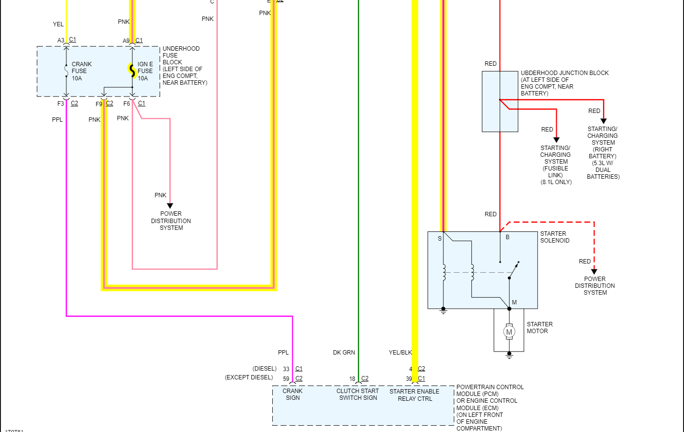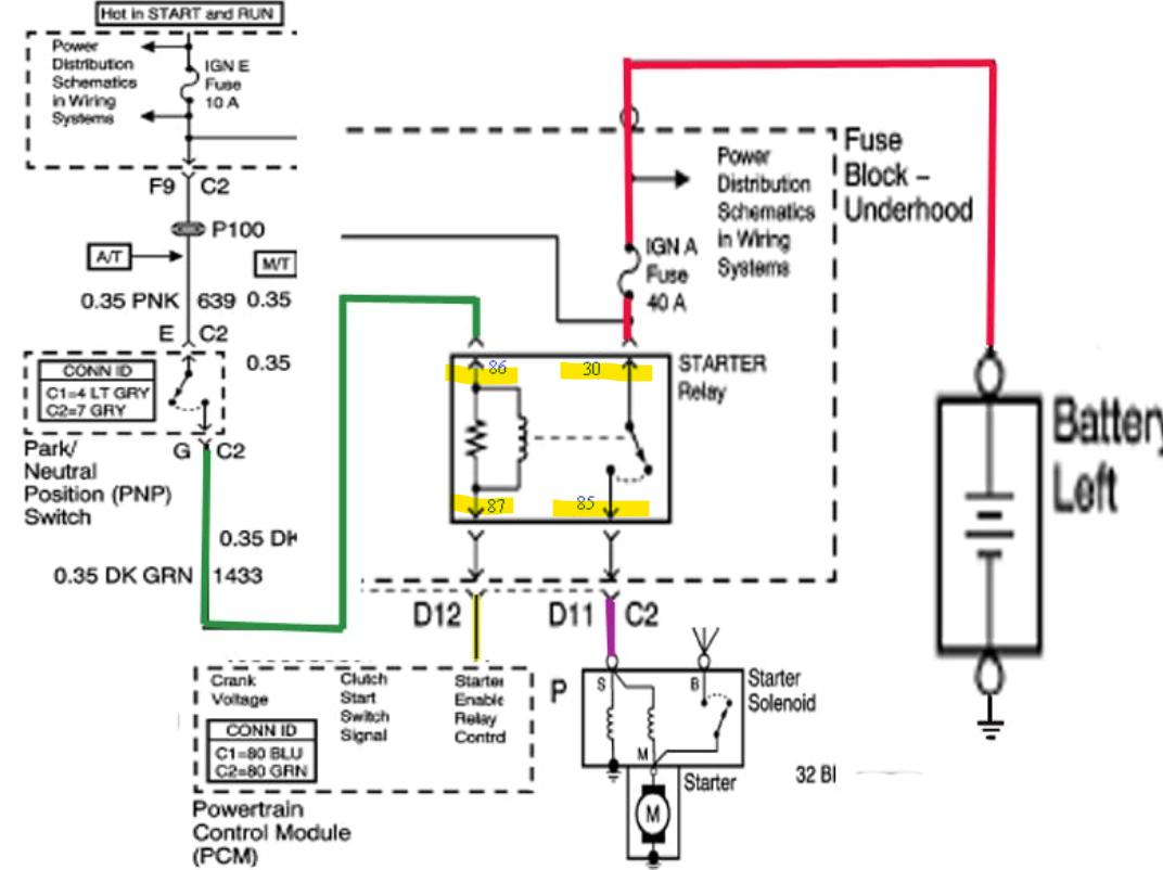 The 3rd diagram is from a 2005 Silverado, it has the pins labelled. You can see pin 87 is the pin that the ECM grounds to turn the relay on completing the pin 30 and 85 circuit and powering up the starter.
