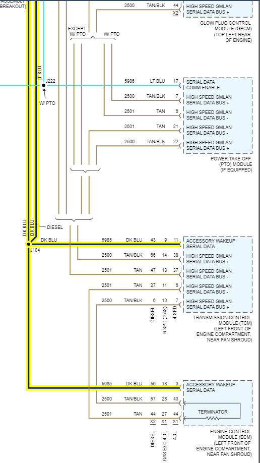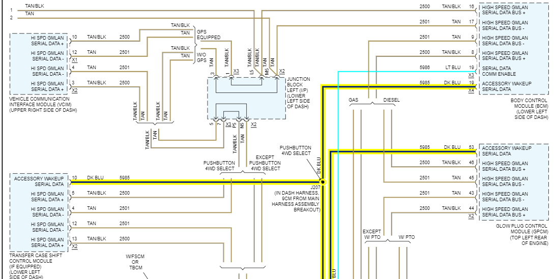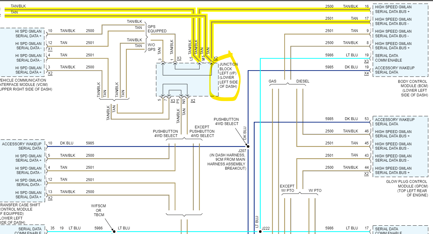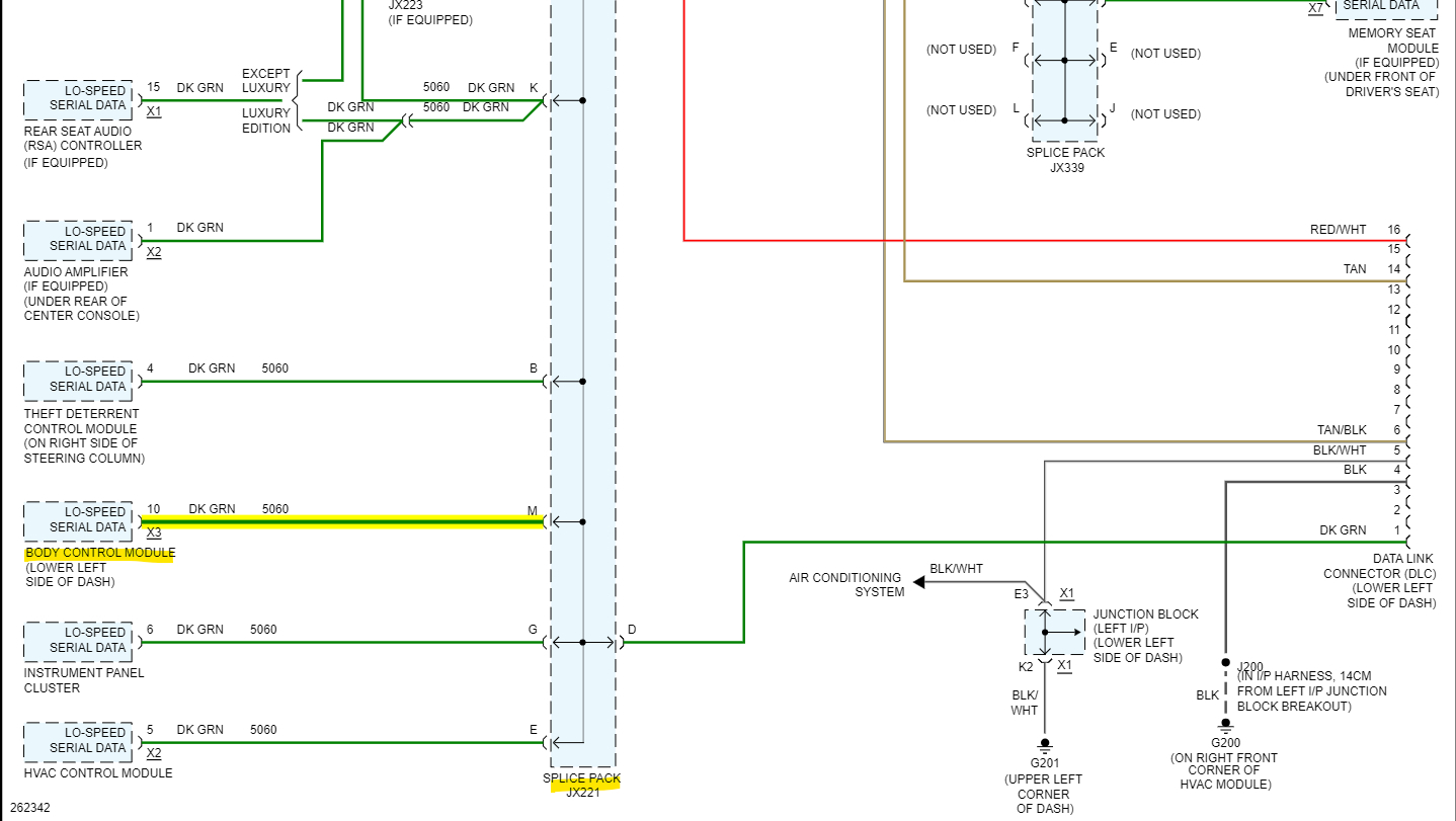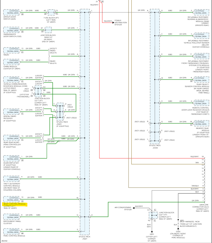 And yes, you are correct on the jx221, all the wires are green. There are actually 2 splice packs like that. Diagram 2 shows all the Low-Speed modules and diagram 3 is all the High-Speed modules. And the BCM is the gateway between the 2 networks, so you can see it being down causes all kinds of issues. Also, you can see the High-speed mods are all 2 wire network connections, GM calls is a GMLAN Serial Data bus, but its actually a CAN BUS type. Its 2 wires so if a circuit fault occurs most of the time messages can still get through for safety reasons. But only 4 out of all those modules is setting codes,