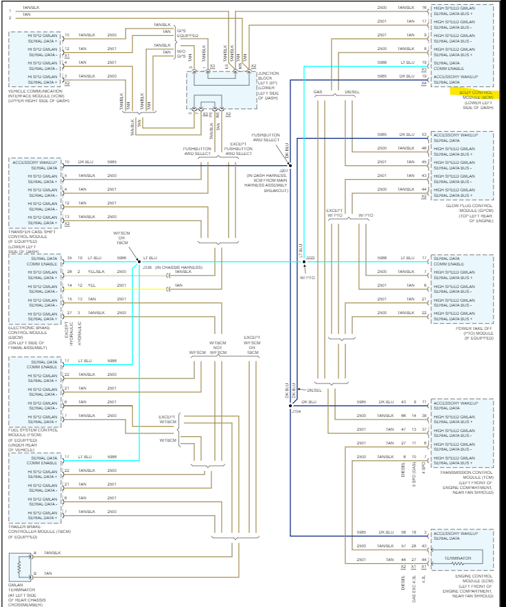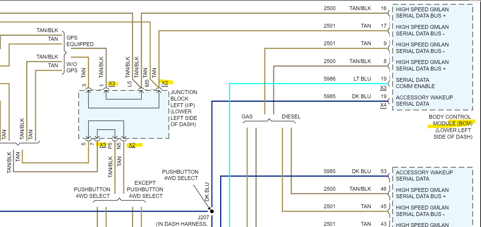 Yeah, I was looking at that X2 connector as well, Service info is not always correct so we have to do the best we can with what we have. In your 3rd post up, that module with all the colored connectors almost looks like the BCM, except I count only 6 connectors, I think. I'll double check that. I have seen so many BCM failures on these GM setups, any shorts seem to just disable the entire thing. But usually what happens is all the other modules with use the last known good data from the BCM to keep the vehicle running, which is why I think there is an issue with the High-speed network, The High-speed modules are the more important modules such as the ECM, TCM, ABS, etc. Things that have to do with safety, And the low speed is for lower priority components. But I want to help you get this thing back up and running.