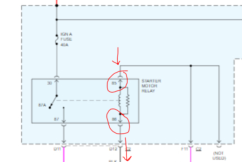 With the key in the start position, pin 85 should have power. Pin 86 is the ground source for the primary side of the relay and should have continuity to ground at all times.