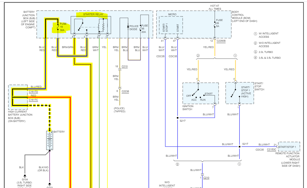 Since the starter isn't engaging, I attached the starter wiring schematic below, so you have a reference. I highlighted primary wiring. The first thing I need to know is if 19 in the battery junction box (under the hood) is good and has power to and from it.