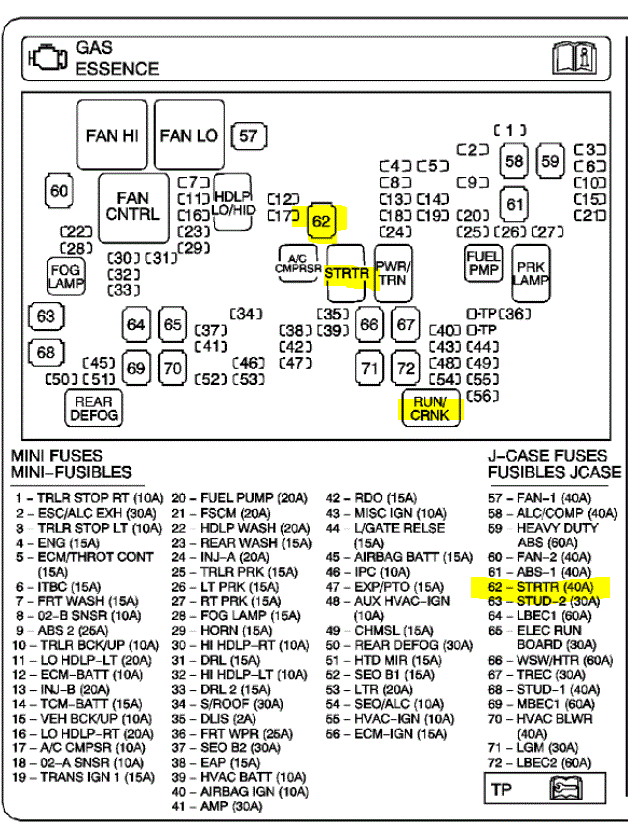 First, confirm fuse 62 in the under-hood fuse box is good. Note, it should get power only when the key is in the start position, so have a helper turn the key while you check for power. Here is a link to help with checking:
