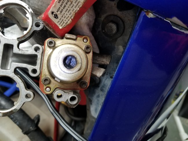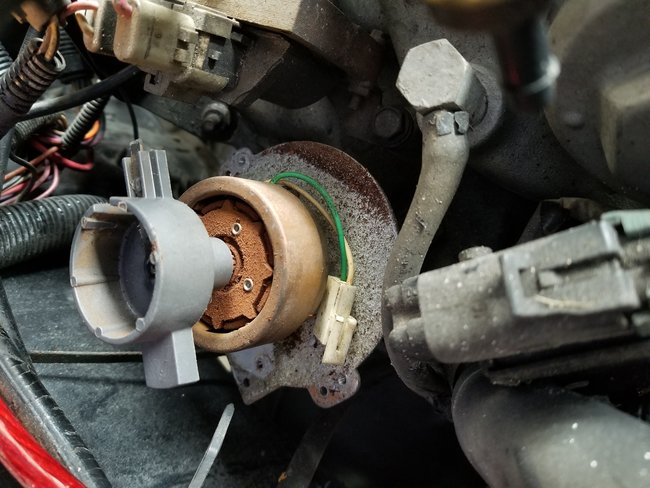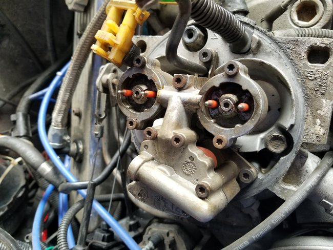 I am getting no fuel from the injectors. New fuel pump (working), new filter, injection control module is good, and I have spark. Fuses are good too. I checked the injectors and one of them is good, the other is bad. Would one bad injector cause there to be no fuel from the good one? I am thinking the fuel line from the filter up to the TBI unit could be clogged. When I removed the old pump it had a lot of gunk in it. Obviously I need to replace the injector that is bad, but that still will not solve the issue, or will it? I have even heard that the distributor is the cause of my issue. See pictures.