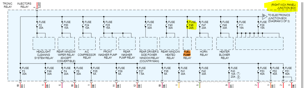 I only found one fuse, #46 for the fuel, 20 amp, good on both sides. Checked rear fuel tank pump on rear passenger side under the seat. No power, only 2 grounds with ignition on, and a 3rd that gives me beeps and.2 oe.3 without stating what it is, and sometimes I touch it and it gives me nothing, maybe this is the signal wire, the 4th gives neither power nor ground. Could not see a relay, diagram in back of cover shows pictures of fuses ok ly, there is only one relay on bottom part of fuse box. Can you find out where the relay is? Has to be a relay or a fuse box issue since am not letting power. No fuel comes out of front, no sound from pump, switched it with my friend's pump and same results.