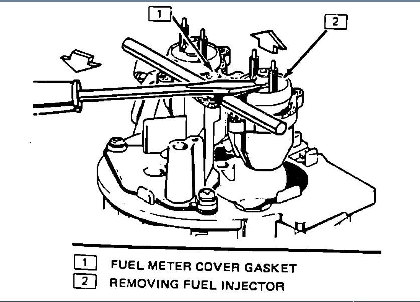 3. With fuel meter cover gasket in place to prevent damage to casting, use a screwdriver and fulcrum to carefully lift out each injector.