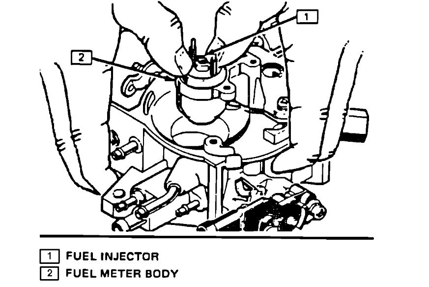 4. Install injector, aligning raised lug on each injector base with notch in fuel meter body cavity. Push down on injector until it is fully seated in the fuel meter body. (Electrical terminals of the injector should be parallel with throttle shaft).