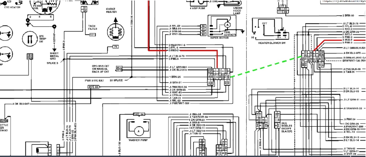 With Ford's regulator design, we have to apply 12 volts to one terminal to bypass it. That's easiest to do right at the regulator, on the inner fender. With Chrysler alternators, there are two wires plugged into it. The blue one is the 12-volt feed for the field coil and the remote-mounted external voltage regulator. The green wire at either location gets grounded to bypass the regulator. That's easiest to do right at the back of the alternator. Newer Fords in the '90s use the same circuit, but have a designated "test" terminal built in on the back of the generator. That also gets grounded.