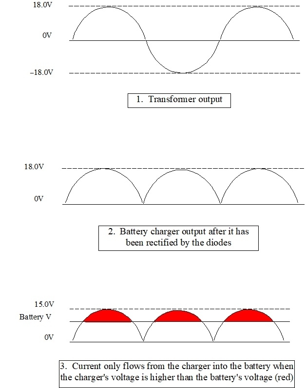 To do justice to this explanation, it's easier to start with battery chargers. Here again, if you don't follow this, or if it becomes too tedious or confusing, we'll still get through this. Alternating current in your house wiring changes direction back and forth 60 times per second, (60 cycles per second, or 60 hertz). Even this will become important later. When graphed, the waveform looks like the first one in the first image below. After it passes through a transformer, we get the same waveform, but a lower voltage version. Plus and minus 18.0 volts is shown. That would be typical for a larger wheel-type charger set to a medium charge rate. Diodes in the charger redirect current during the negative half of the cycle to positive current flow. The waveform, and current flow, look like the second waveform. Output voltage, (pressure), goes from 0 volts to 18 volts in this example.