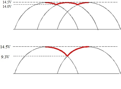 Enough suspense. The third method of operation with AC generators is when there's a failure of one diode. One of the three phases is lost, as shown in the lower waveform in the third image. Ripple voltage here is 5.2 volts, (14.5 †9.3 volts), but it would simply show up as "high" on the tester.