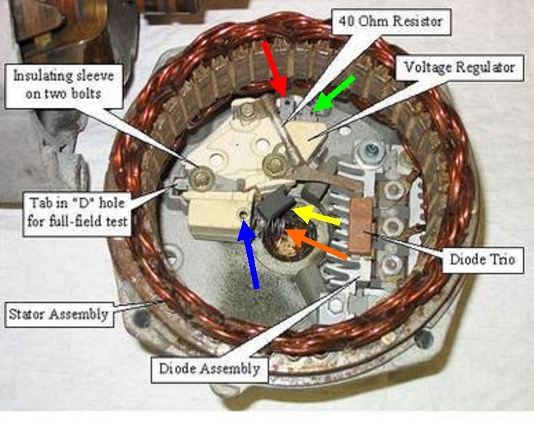The question often arises about "upgrading" to a replacement generator with a higher output current. There are also kits available for modifying the generator you already have. All that's needed to get that higher current is to add a few inches of copper wire to the stator coils, and to replace the six diodes with those than can handle the higher current. When contemplating this modification, it's important to remember it doesn't matter what the generator is capable of. They all are just going to develop the amount of current that is needed, and no more. Similarly, a massive water pump can fill a municipal water tower in a few days, but once full, it will only pump as much water as needed to keep the tower full, and no more.