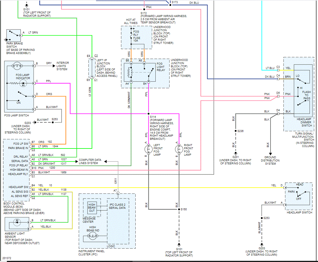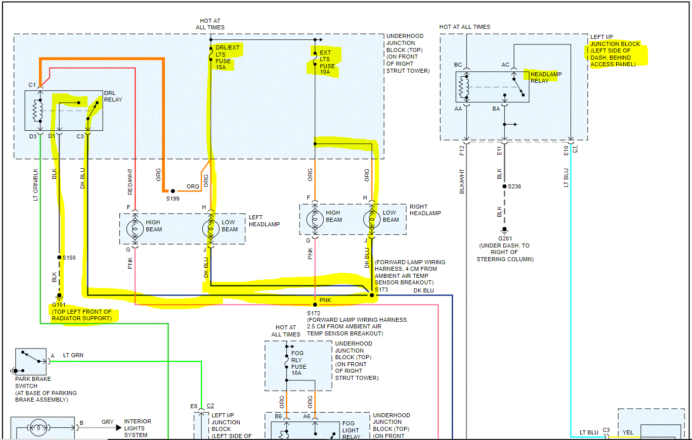 I attached the wiring schematic for the DRL and headlamps. I had to cut it in half to make it readable, but I did overlap them so you can follow from one to the next.