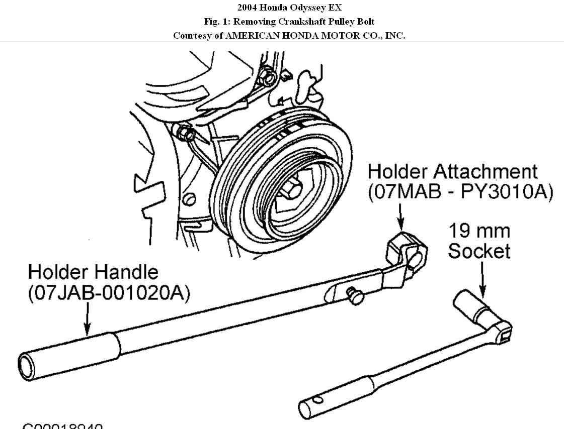 2. Support engine with a jack and wood block under the oil pan. Remove ground cable (if necessary), then remove engine side mount bracket. If necessary, remove dipstick tube from front of engine (discard "O" ring). Remove crankshaft pulley. See Fig. 1. ( A high toruqe impact wrench works but at times it might be rather stiff.