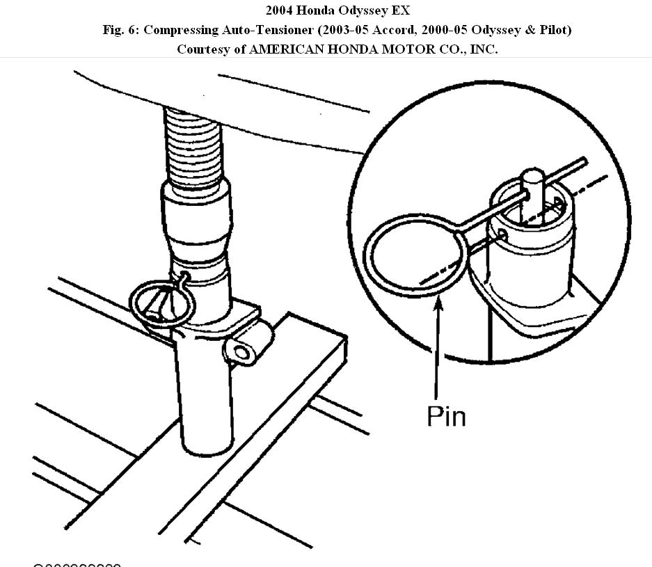 3. Place sealed auto-tensioner in press. SLOWLY compress tensioner until pin can be inserted through tensioner body, and insert pin. See