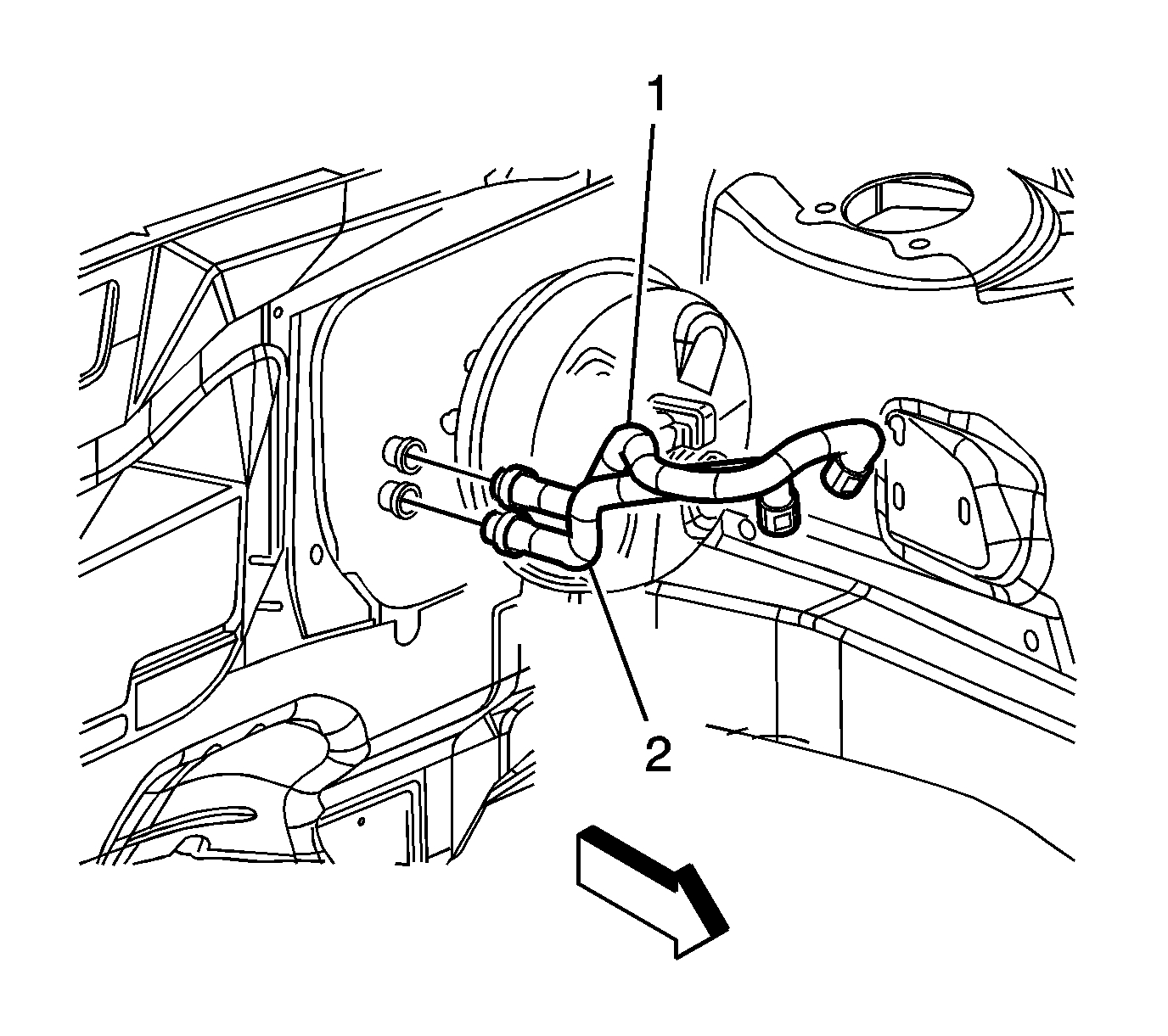 2. Disconnect both of the heater hose clamps (1) at the heater core using the J 38185.
