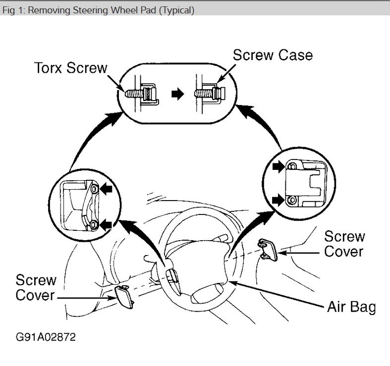 C. Remove the steering wheel cover pad by loosening the torx screws. Back them out until the heads run into the the top of the screw case See the image attached below.