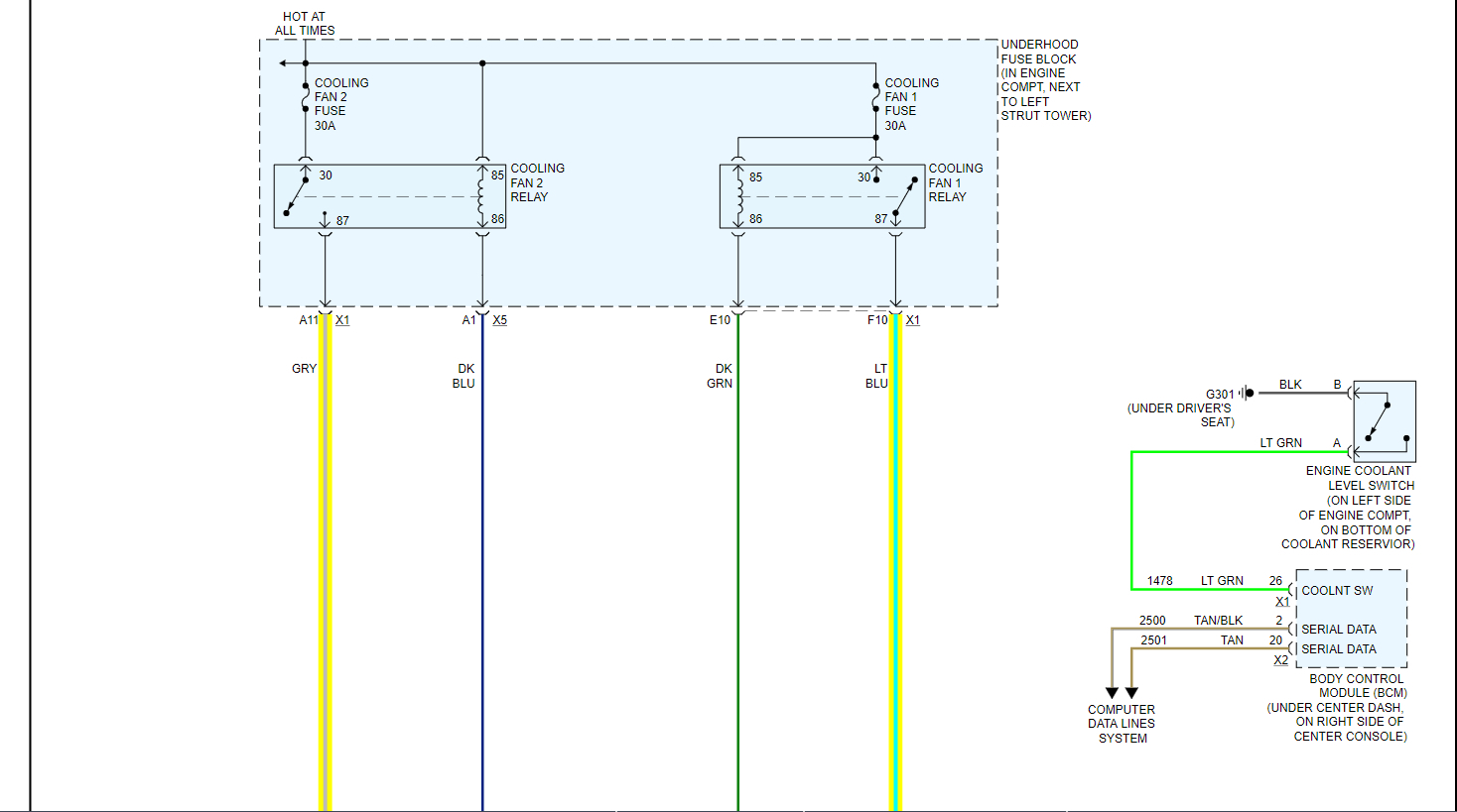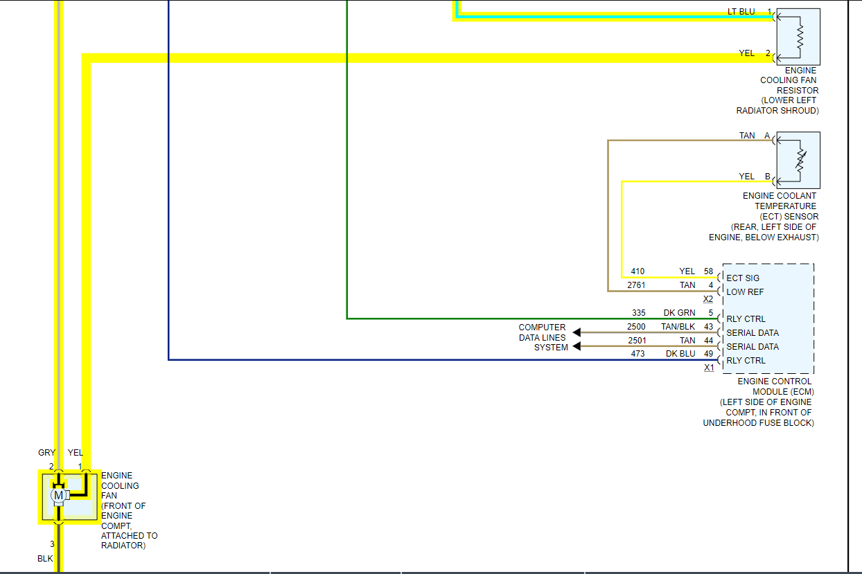I have a 2-speed single cooling fan. I am having issues where the low speed fan does not seem to come on, and yet the hi-speed fan is blowing the 30A fuses. I have swapped relays from Cool Fan 1 and Cool Fan 2 with no change in symptom. Cool Fan 2 does kick in at temperatures over 200 degrees F, but does eventually blow the fuse. Am I right in believing I have an issue with the low speed resistor? It is my belief that by the time the hi-speed fan (cool fan 2 circuit) kicks in (sometimes on quite often), it is overworking as it never kicked on in low speed (cool fan 1 circuit), and it is overheating/blowing the cool fan 2 fuse. I have not tested to see if the ECM is triggering the ground circuit for cool fan 1, but I am thinking with the high mileage as this car has, that it may be a resistor problem. Also, assuming I have to replace this resistor, what is the best method for removal and replacement? Symptom: Car will try to overheat at long lights and A/C turns warmer until cruising again. Due to no low-speed fan coming on. Thanks a million!