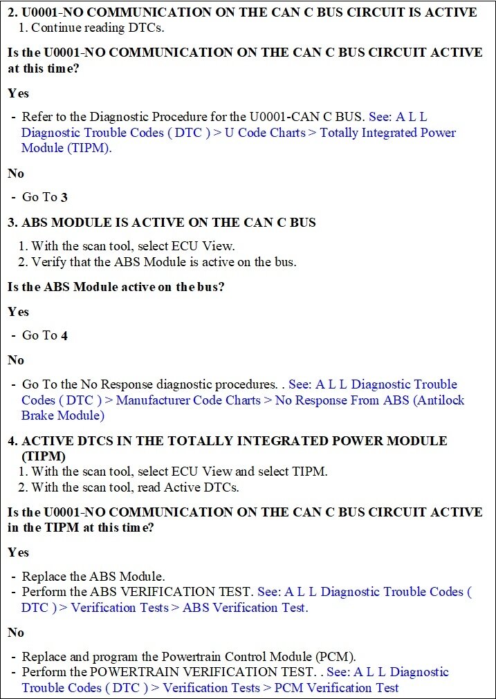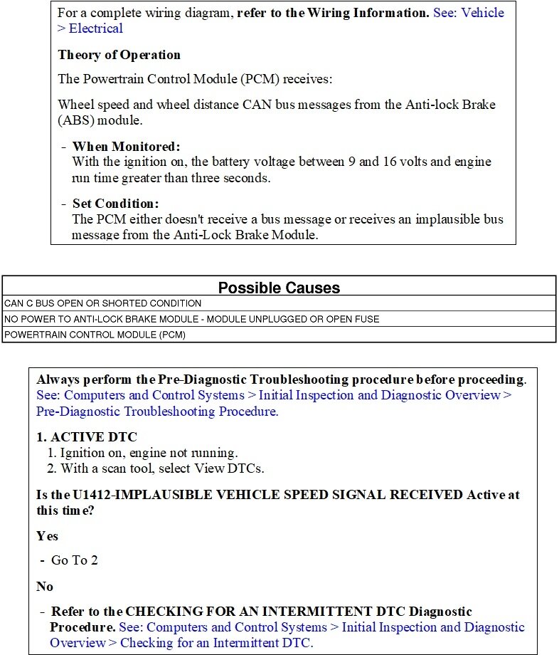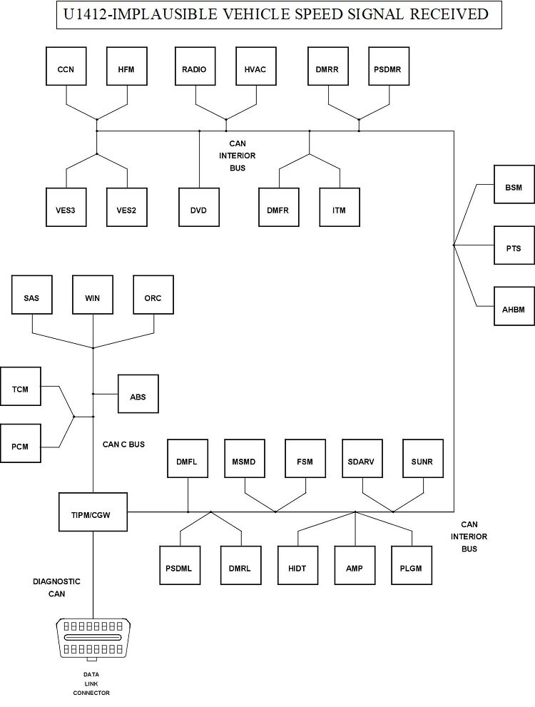 Here's the diagnostic chart for code U1412. The charts for the other two codes are very similar. On older models, a "data buss" is a pair of wires the computers talk back and forth to each other on. On models as new as yours, there can be up to four data busses. The chart on the first page simply shows all the computers that are on Buss "C". That is a relatively low speed buss as the data has little importance to instantaneous decisions, like it is with air bags.