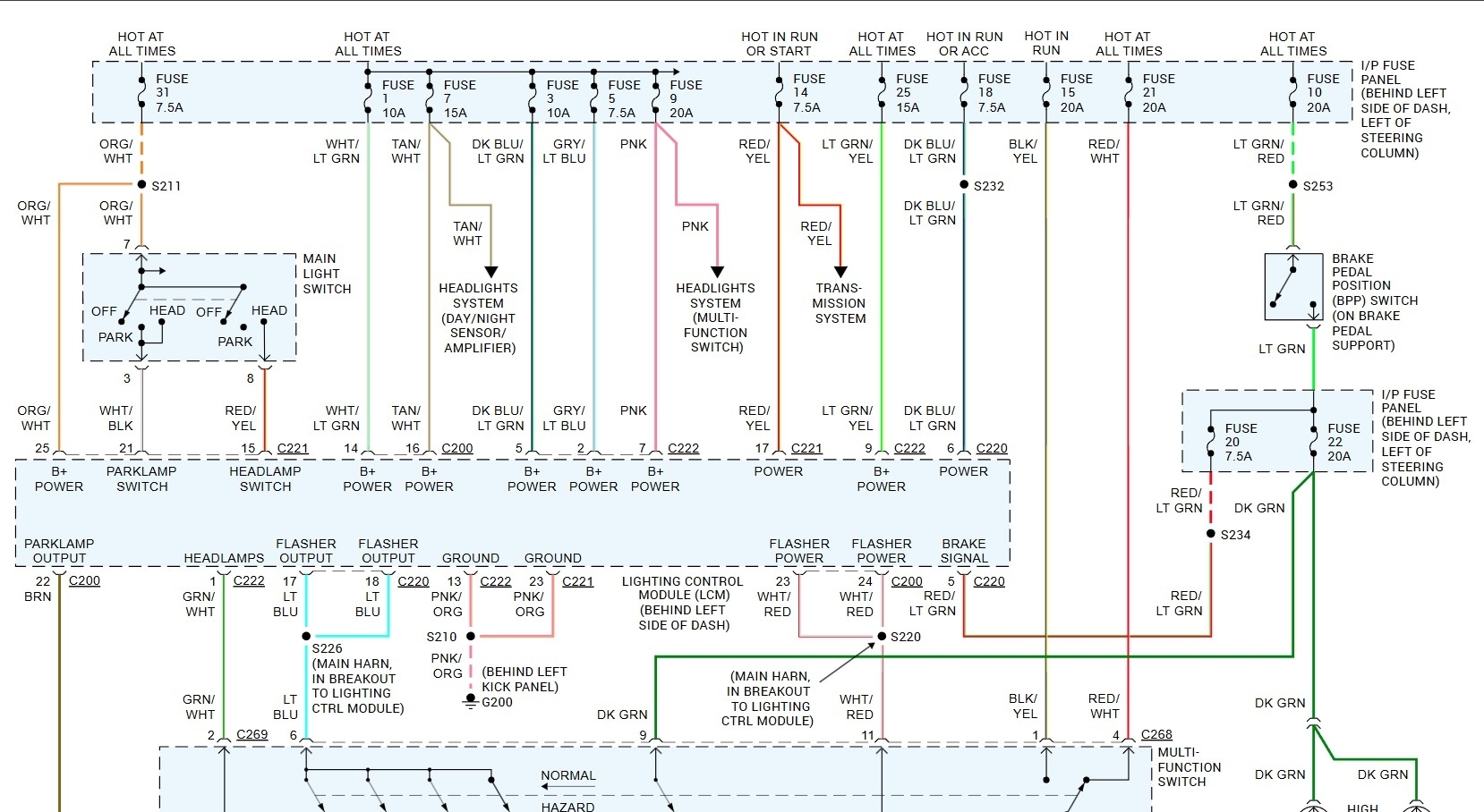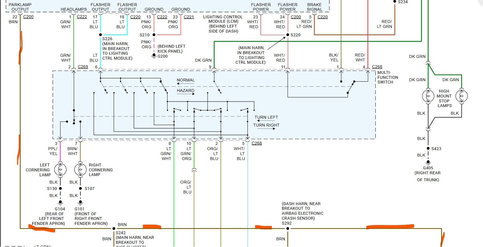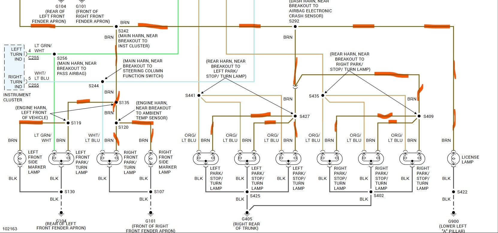 As shown in the attached you can see the brown wire is the feed to all of the tail and marker lights that are out. From the melted harness and light failure, it sounds like the lighting control module has likely burnt out from a load on it. The brake lights are all fed from the same switch and fuse. So that switch and fuse are OK. It then feeds the dark green that goes through the switch and to the lights on 2 different circuits.
