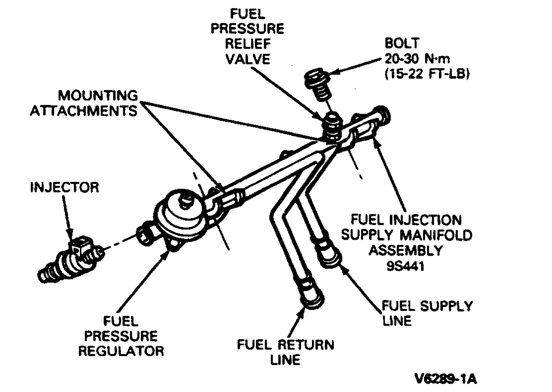 6. Install the fuel supply manifold and injectors with two retaining bolts. Tighten bolts to 20-30 Nm (15-22 ft lb).