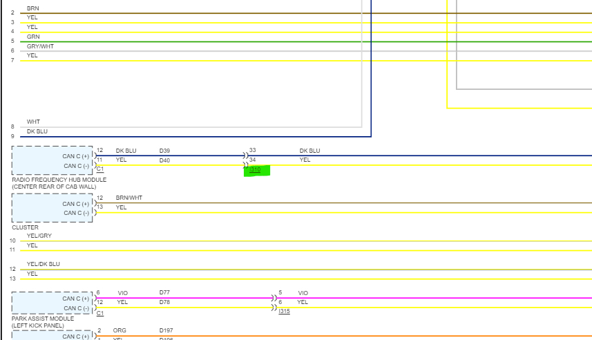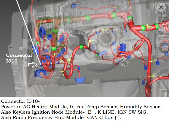 Okay, I've narrowed it down to a couple of connectors. This connector I310 is a bulk connector in a place that can possibly be exposed to moisture intrusion, down by your left leg as in diagram 1. It has the power feeds to the Hvac Module, Humidity sensor, In-car Temperature sensor, plus an Ignition switch feed, K Line network, CAN C Bus Network Low side, for the Keyless ignition Node Module and Radio Frequency Hub Module (for remote start). I don't know what else runs through this connector, so I wouldn't just pull it apart, It may have SRS (airbag) wiring running through it. And you don't want to set any of them off. But this connector may have corrosion inside of it effecting some pins and causing voltage drop across it. (Diagrams 1 through 4)