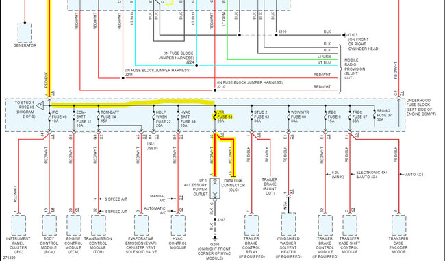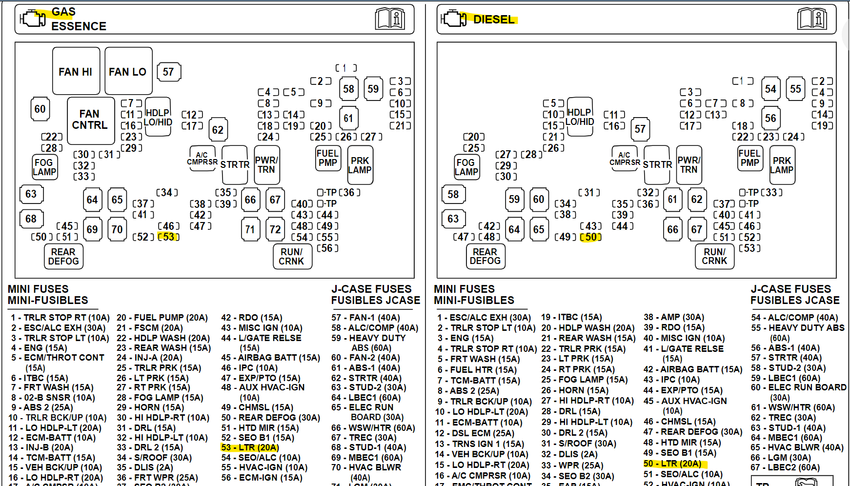 There's a couple of different fuses depending on gas or diesel engine, and whether it's a 6.6liter or different size. The gas engine is in the under-hood fuse panel and looks to be the LTR (20amp) fuse #53. On the diesel engine it's still the LTR (20amp) but labelled as fuse #50.