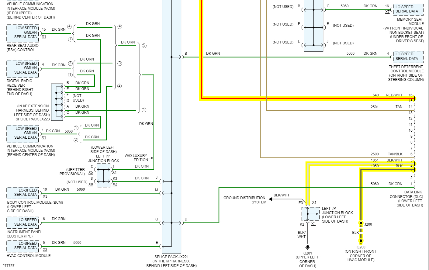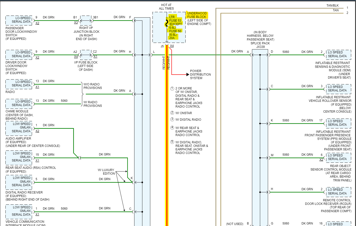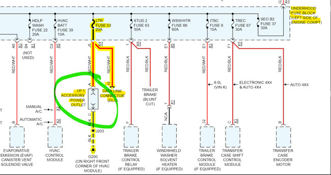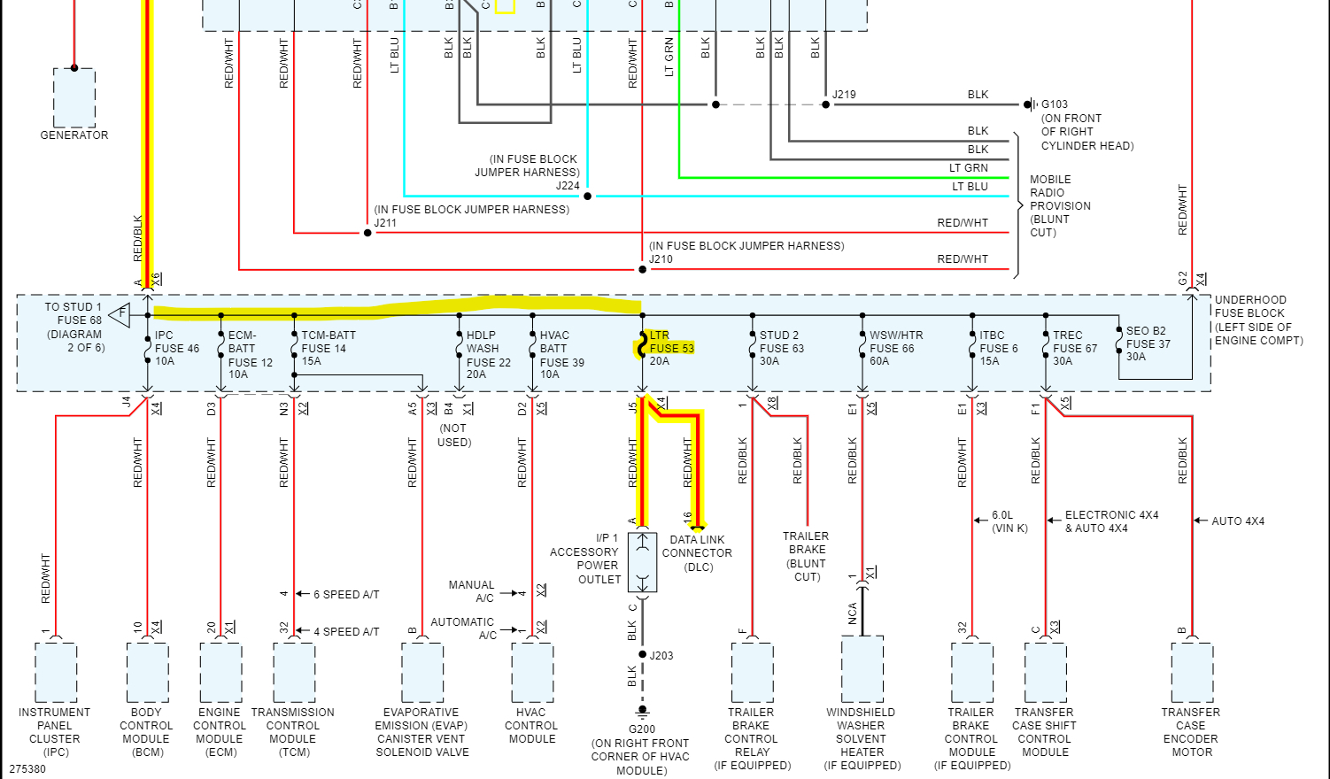 So, it will be either Fuse 50 or 53 LTR 20amp, on the gas engine Fuse #50 is Rear Defog 30amp. So, you will be able to tell by the amperage of the Fuse and hopefully the fuse box has labels on it. Check both sides of the fuse with a test light. Pins 4 and 5 should be Grounds. I'll post a diagram of the Data Link Connector, what scan tool are you using?
