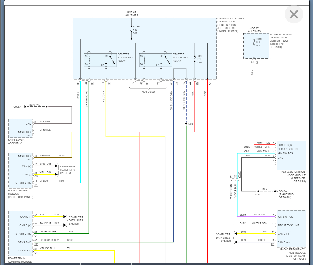 Otherwise, we are going to have to monitor the voltage from the KIN to the right front hub on the violet and blue wire to see if this is telling the right front hub that the key is being turned.