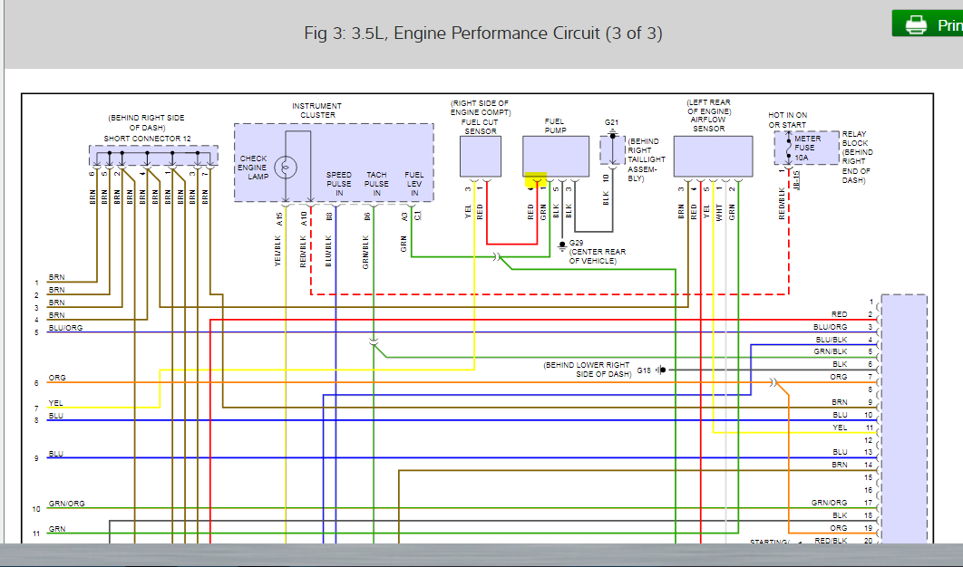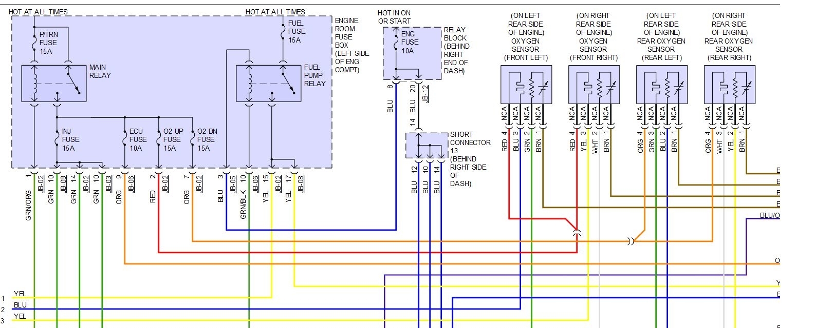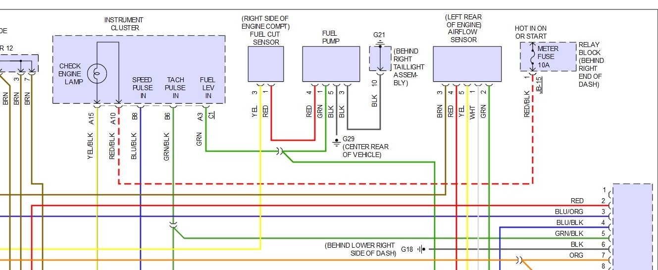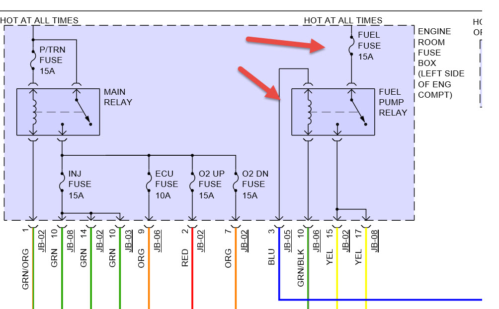 A full line trace shows the relay fed by the fuel fuse, then out of the relay as a yellow wire to the fuel cut sensor, out of the sensor the power is now on a red wire to the pump.
