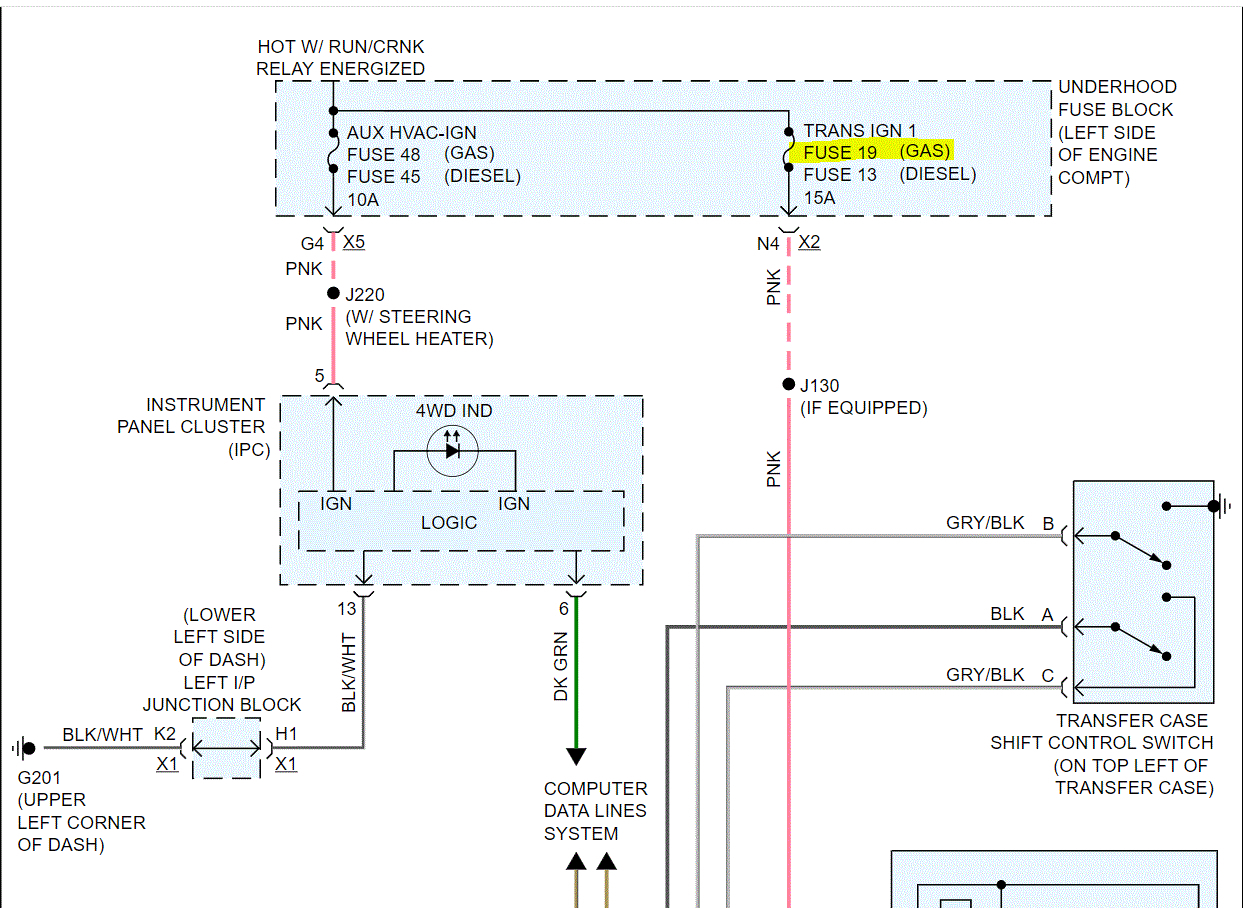 If you look at the schematic below, the pink wire going to the front axle actuator should have power when the run/crank relay is actuated. Since the cluster light works, I have to assume the relay is good.