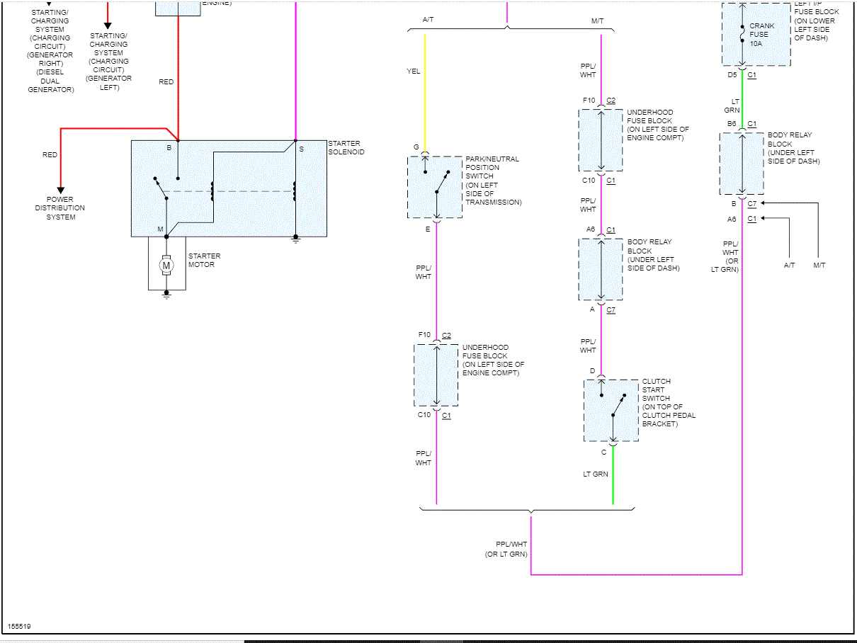 Next, if the fuses and relay are good, then we need to check if the relay is getting power to the primary side. If you look below, I attached the wiring schematic for the starting system. Note there is a purple wire from the neutral safety switch. That wire powers the coil on the primary side of the relay. When that happens, an electromagnetic field is created, and the secondary side is closed allowing power to go to the starter (S terminal).