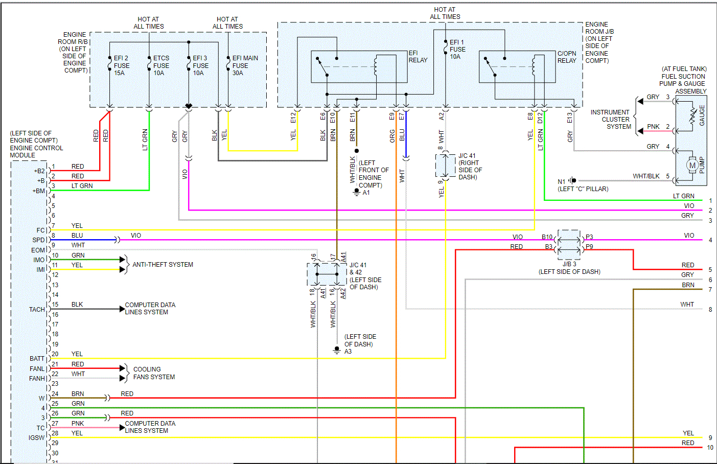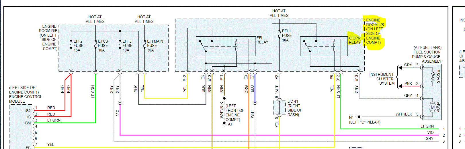 Hello, my name is Alex and my friend's car listed above seems to be not getting any voltage to the fuel pump. The fuel sending wires have battery voltage but the pump does not. I have jumped the pump and it does turn on. I have tested the fuses and everything checks fine. I guess what I'm asking is for the location of the c/opn relay. Thanks.