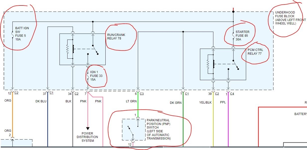 Also, I attached a portion of the starting system schematic. I circled thing I need you to check.