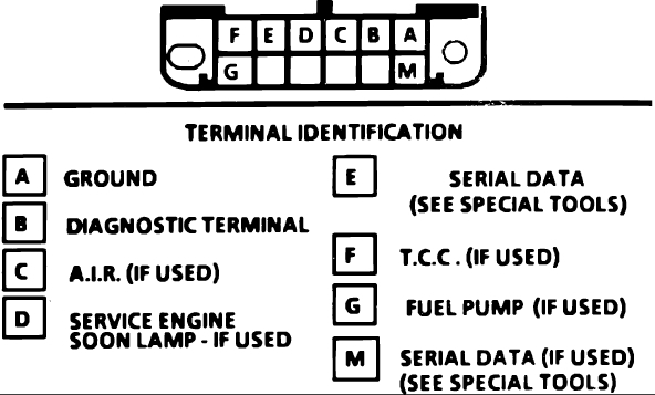 The ECM incorporates a diagnostic program which, when activated, will flash codes stored in the trouble code memory through the ``Check Engine'' Lamp (CEL). A diagnostic connector, located under the instrument panel, is used to activate the self-diagnosis system. The connector, Fig. 6, allows access to system circuits and contains a test terminal which, when grounded with the ignition on and engine stopped, causes stored trouble codes to be flashed on the CEL.