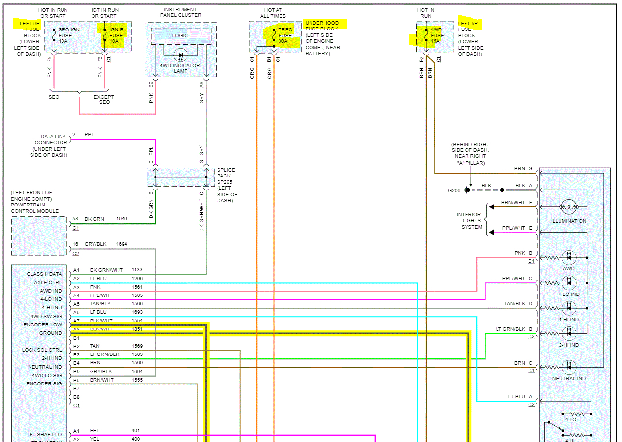I've had issues with this 4wd system in the past that were fixed by cleaning up the ground on the frame, replacing the dash switch, and more recently replacing the encoder ring and motor. The 4WS, 4WD, and IG1 fuses are all ok and have power when they key is on.