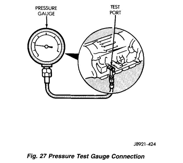 1. Connect pressure test gauge to test port on passenger side of transmission. Use Adapter 7554 to connect gauge. Be sure test gauge has minimum capacity of 300 psi (2100 kPa).