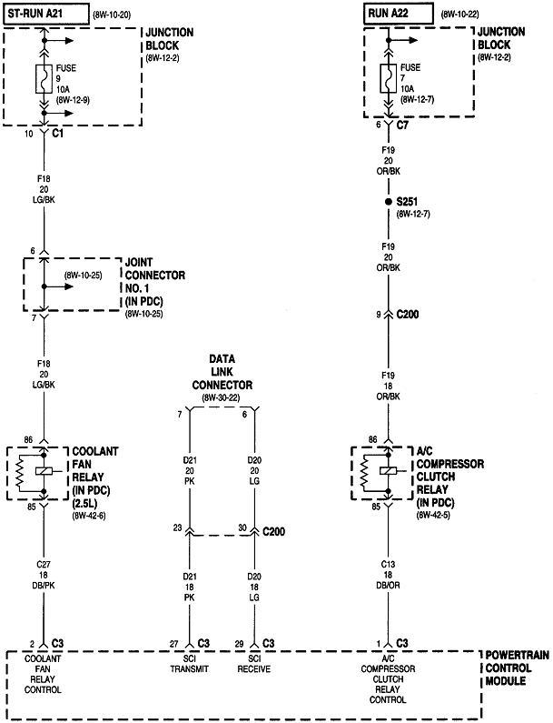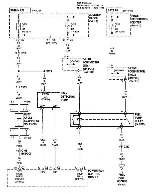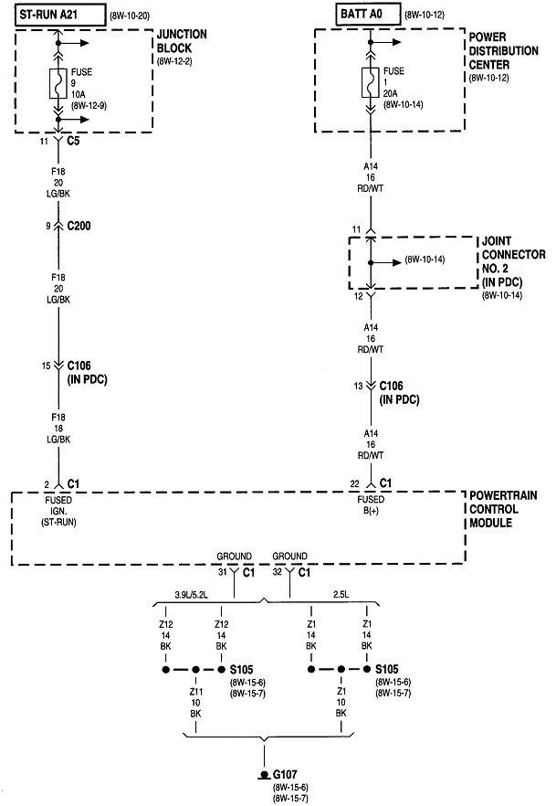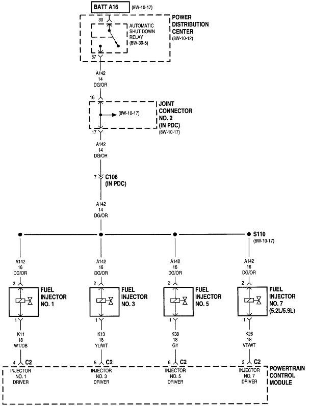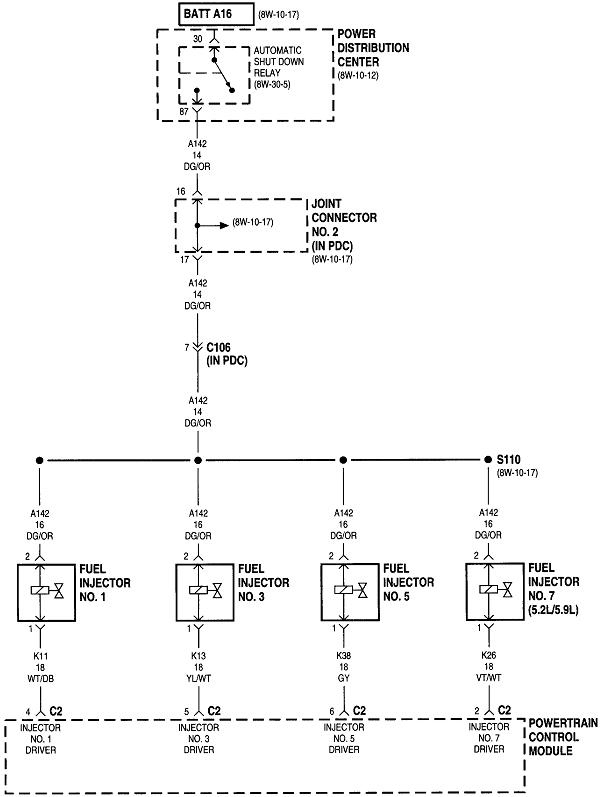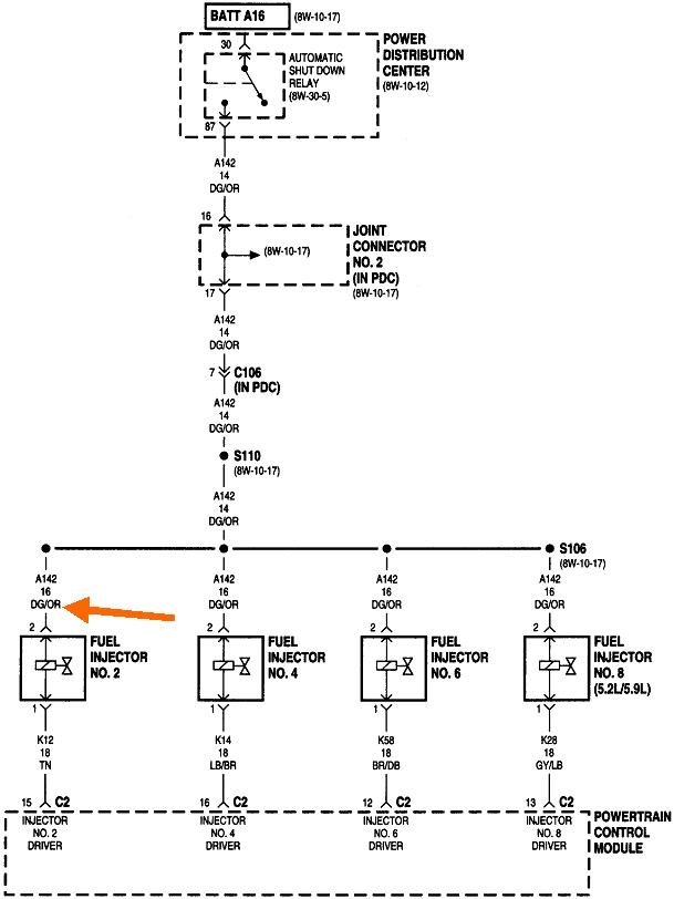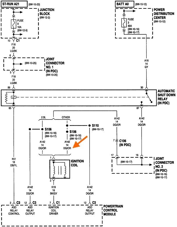 The ASD relay sends current to the ignition coil, injectors, alternator field, oxygen sensor heaters, and the fuel pump or pump relay. On your truck that is the dark green / orange wire. Back-probe with the test light through the rubber seal around that wire at the ignition coil or any injector. You can also use either of the two smaller terminals on the back of the alternator, but those are usually not real easy to reach. Expect to see the test light turn on full brightness for one second when you turn on the ignition switch. Next, it must turn on again when you start cranking the engine. This is where you'll usually find it does not when you have a crank / no-start problem.