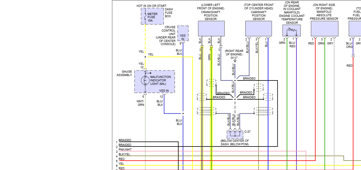 Well the crank sensor has to be somewhere it is able to be in contact with crankshaft to pick up a signal, so according to the book it should down there, but if you can dig around a bit in the wiring harness and find these plan green and blue wires together (and they look like they are shielded together to prevent the signal from being interrupted to ground) you should be able to find the sensor. Take a good look at the diagram I sent you, it is going to be a three wire sensor with those colors, the crank position sensor is a main input to the ECM, so you should not have too much trouble locating it. There wont be any other sensors with the same wire coloring. Sometimes as a Tech you have to dig a bit with little information to find a problem. Keep looking you will find it. Sensor wiring blue, green, black/blue. That is your crank sensor. Do not let it beat you.