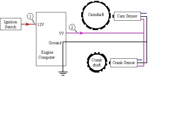 2. The computer generates a carefully-regulated 5.0 volt power supply to run multiple sensors, including the cam and crank sensors. That 5.0 volts feeds the two sensors on the purple wire. The ground return wire is common to all the sensors on the engine. It goes through the computer so it can be monitored. At this point, the sensors are waiting to start detecting movement of their sprockets or tone rings by looking at the notches cut into those sensor rings.