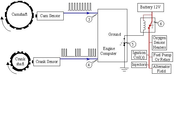 5. When the computer sees both signals at "3" and "4", it turns on its internal switch to ground the coil inside the automatic shutdown, (ASD) relay.
